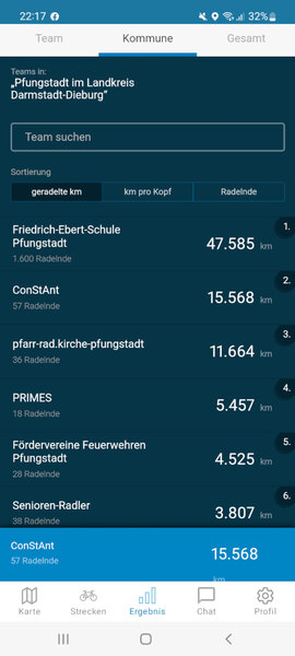 Teams von Schulen haben eine Extrawertung und werden nicht in die reguläre Teamwertung einbezogen werden, daher radelt "ConStAnt" an der Friedrich-Ebert-Schule vorbei. Kilometer können noch bis Donnerstag nachgetragen werden. Wir glauben aber nicht, dass es hier noch überraschende Überholmanöver von anderen Teams geben wird.