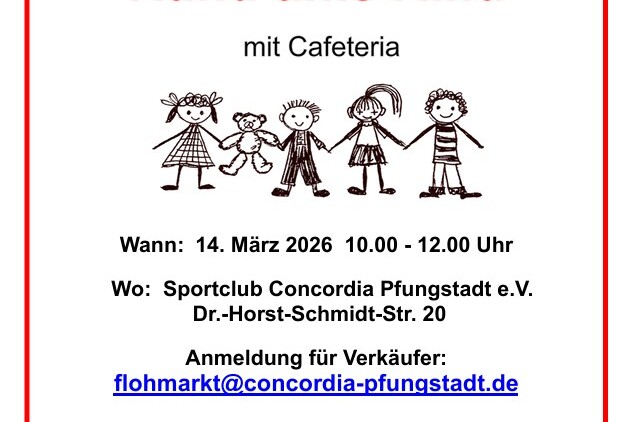 Reservierungen für Tische und Stellfläche für den Flohmarkt Rund ums Kind können ausschließlich über die Mailadresse flohmarktconcordia-pfungstadtde ...