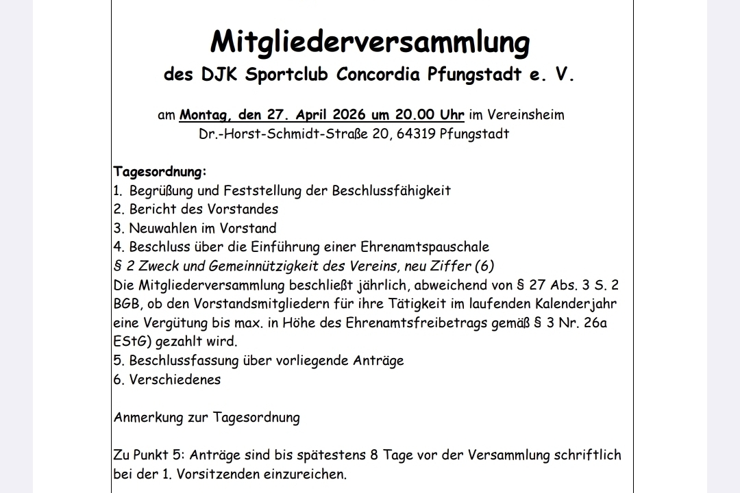 Einladung zu a.o. Mitgliederversammlung des DJK Sportclub Concordia Pfungstadt e. V.