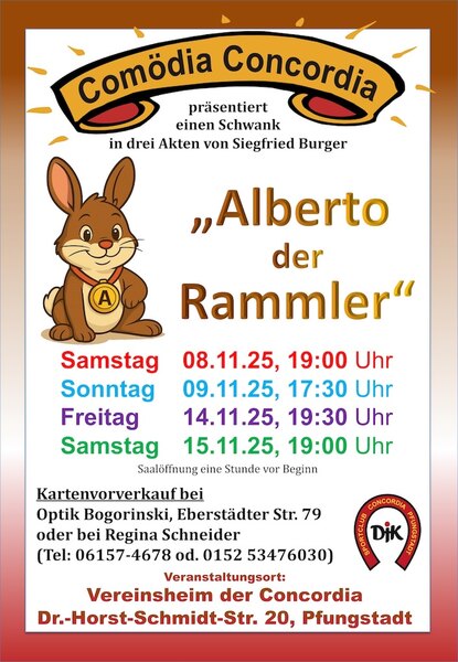 Die Laienspieler der Comödia Concordia laden dieses Jahr am 8. November zur Premiere des Stücks "Alberto, der Rammler" ein. Weitere Aufführungen finden am Sonntag 9.11., Freitag 14.11. und Samstag 15.11. statt. Wichtig: Die Vorstellungen am Samstag 8.11. und 15.11. beginnen, anders als in den Vorjahren, bereits um 19:00 Uhr mit Saalöffnung um 18:00 Uhr. Der Kartenvorverkauf läuft auf Hochtouren, aber es sind noch Karten für einige Abende bei Optik Bogorinski erhältlich.