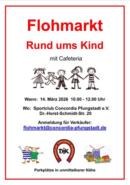 Reservierungen für Tische und Stellfläche für den Flohmarkt Rund ums Kind können ausschließlich über die Mailadresse flohmarktconcordia-pfungstadtde angefragt werden. Das Postfach ist jetzt für den Termin am 14.03.2026 geöffnet.