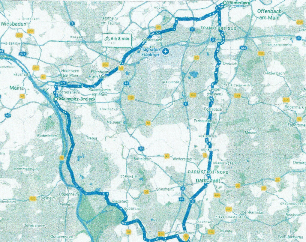 Los geht's über Darmstadt, nach Langen, Neu-lsenburg, Frankf.-Süd zum Römer. Einfache Strecke 43 Km - 2,20 Std. Fahrtzeit. Nachdem wir uns alle ausgeruht und gestärkt haben, geht es - wer möchte - am Museumsufer entlang zum Mainspitz-Dreieck über Schwanheim, Kelsterbach, Raun-und Rüsselsheim nach Ginsheim - Gustafsburg und Rückfahr am Rhein entlang Richtung Kühkopf zum Ausgangspunkt nach Pfungstadt. Wem dieser Teil des Tagesausfluges zu weit erscheint, kann gerne mit der Regionalbahn vom Hbf. Frankfurt bequem wieder nach Hause fahren. Gesamtumfang der Strecke 117 Km - 6 Std. F.-Tour