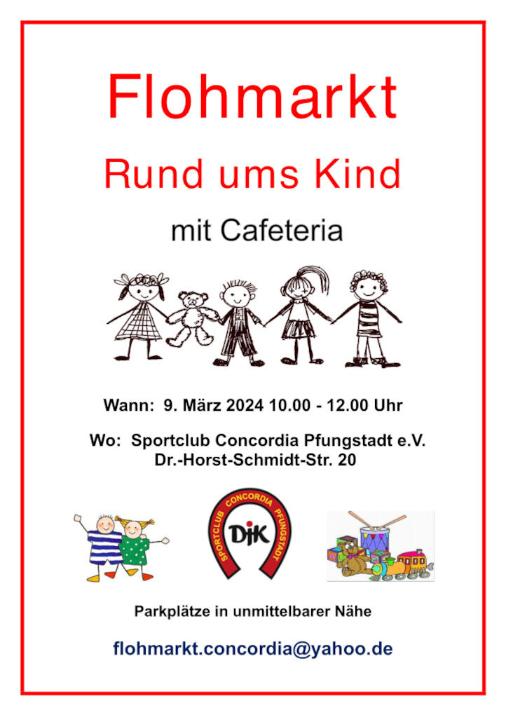 Der Sportclub Concordia Pfungstadt veranstaltet am Samstag, den 09. März wieder den Flohmarkt "Alles rund ums Kind". Von 10 bis 12 Uhr werden in der Dr.-Horst-Schmidt-Str. 20 in Pfungstadt Baby- und Kinderkleidung, Spielsachen, Bücher und vieles mehr angeboten. Sowohl im Hallenbereich als auch auf dem Außengelände kann nach Lust und Laune gefeilscht werden. Kaffee und Kuchen sind ebenfalls im Angebot. Wer Interesse hat, bei diesem Flohmarkt zu verkaufen, kann sich gerne unter der Mailadresse flohmarktconcordia-pfungstadtde anmelden.